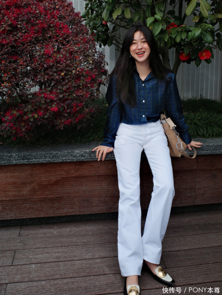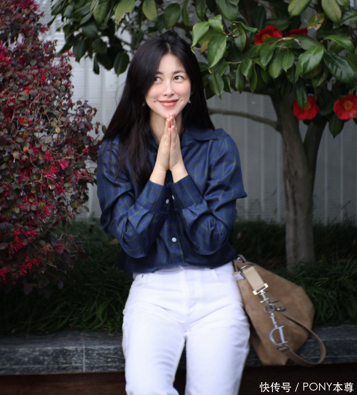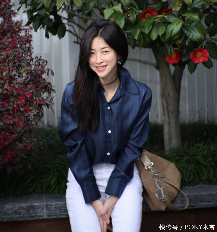 二、蓝色格纹衬衫+小白裤,色彩平衡的刚刚好!朱珠身穿一件蓝色光面设计的衬衫,搭配一条修身小白裤,堪称是职场女性早春通勤的“教科书”,搭配麂皮棕色单肩包,她用多种沉稳的色彩搭配小白裤,色彩与层次的平衡堪演绎春日时尚感。